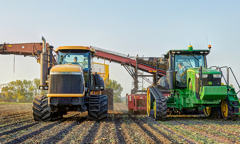 Насіння висівається на полях середньою площею приблизно 65 га, ширина захвату сівалки може досягати 48 рядів, а швидкість руху при посіву до 10 км/год. В США широко застосовуються технології точного землеробства, такі як системи GPS-моніторингу і обробіток сільськогосподарських культур з використанням датчиків. Добре знайомі Європейським буряководам самохідні бурякозбиральні комбайни зустрічається в Північній Америці дуже рідко. Натомість, збирання врожаю цукрових буряків проходить в два етапи. На першому етапі за допомогою дефоліатора з цукрових буряків зрізається або збивається гичка, після чого коренеплоди витягуються із ґрунту копачами, ширина захвату яких коливається у межах від 4-х до 12-ти рядів. Широко поширена практика вивантаження буряків із копача безпосередньо на вантажівки (які пересуваються по полях під час збирання врожаю). Така технологічна операція, можлива тільки у разі збирання при оптимальних погодних умовах.